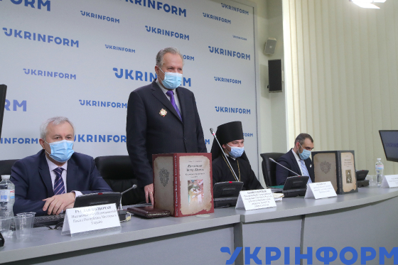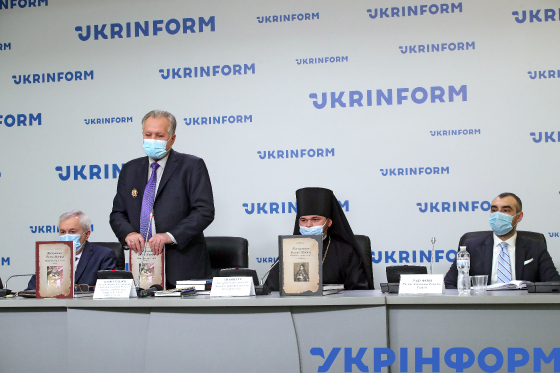 Надзвичайний і Повноважний Посол Республіки Молдова в Україні Руслан Болбочан, Надзвичайний і повноважний посланник України в Румунії, доктор історичних наук, директор Інституту добросусідства Теофіл Рендюк, ректор Київської духовної академії і семінарії, єпископ Білогородський Сильвестр, радник Посольства Румунії в Україні Раду Філіп (зліва направо) під час презентації збірника матеріалів “Митрополит Петро Могила: маловідомі сторінки життя” ІІІ Міжнародної науково-практичної конференції на презентації, Київ, 25 лютого 2021 року.