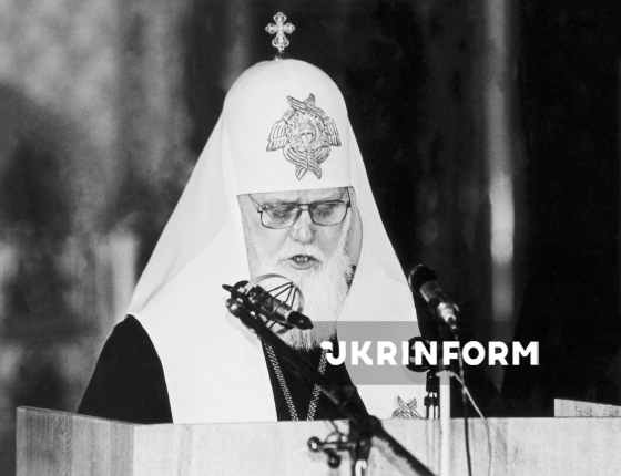 Митрополит Київський та всієї України Філарет доповідає про підсумки урочистого засідання Патріаршого Синоду з нагоди канонізації святителя Петра Могили, Київ, 12 грудня 1996 року. Фото Володимира Струмковського.