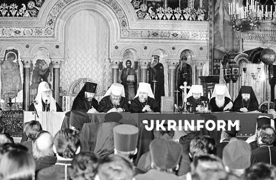 Митрополит Київський та всієї України Філарет (у центрі) бере участь в урочистому засіданні Патріаршого Синоду з нагоди канонізації святителя Петра Могили, Київ, 12 грудня 1996 року. Фото Володимира Струмковського.