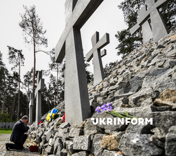 Президент України Петро Порошенко біля Братської могили, у якій захоронені ексгумовані останки репресованих, віддає шану в День пам’яті жертв політичних репресій на території Національного історико-меморіального заповідника "Биківнянські могили", Київ, 15 травня 2016 року. Фото Миколи Лазаренка.