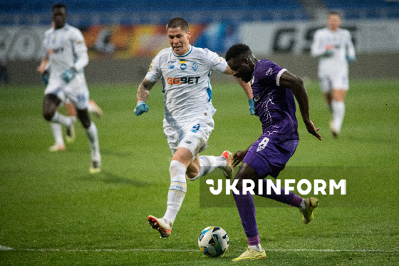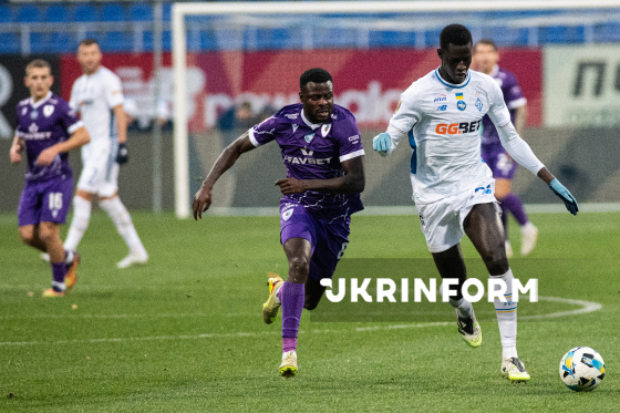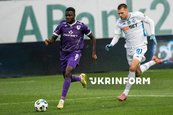 Гравці ФК "ЛНЗ" (Черкаси) Проспер Обах (праворуч) і ФК "Динамо" (Київ) Олександр Піхальонок біжать за м’ячем під час матчу 12-го туру чемпіонату України з футболу серед команд Премʼєр-ліги (УПЛ), що завершився з рахунком 0:1 на користь гостей, на стадіоні "Динамо ім. Валерія Лобановського", Київ, 9 листопада 2025 року.