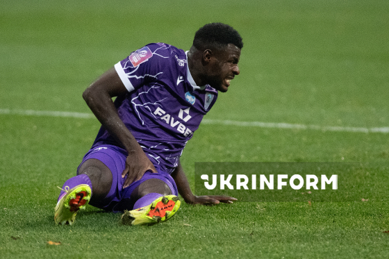 Гравець ФК "ЛНЗ" (Черкаси) Проспер Обах терпить біль після падіння під час матчу 12-го туру чемпіонату України з футболу серед команд Премʼєр-ліги (УПЛ) проти ФК "Динамо" (Київ), що завершився перемогою його команди з рахунком 1:0, на стадіоні "Динамо ім. Валерія Лобановського", Київ, 9 листопада 2025 року.