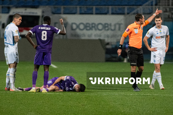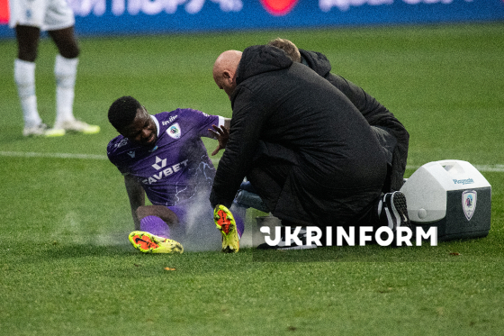 Півзахиснику ФК "ЛНЗ" (Черкаси) Просперу Обаху надають медичну допомогу під час матчу 12-го туру чемпіонату України з футболу серед команд Прем`єр-ліги (УПЛ) проти ФК "Динамо" (Київ), що завершився перемогою черкаської команди з рахунком 1:0, на стадіоні "Динамо ім. Валерія Лобановського", Київ, 9 листопада 2025 року.