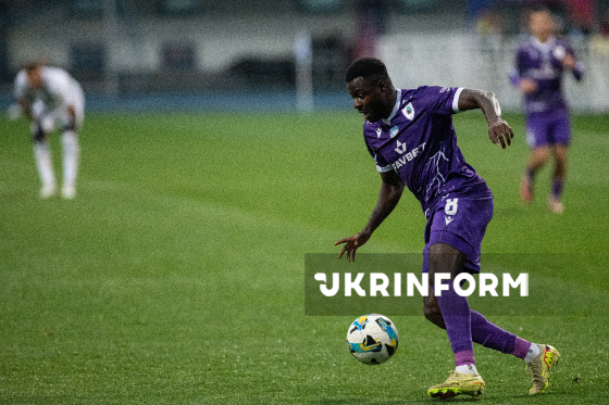 Півзахисник ФК "ЛНЗ" (Черкаси) Проспер Обах б`є по м`ячу під час матчу 12-го туру чемпіонату України з футболу серед команд Прем`єр-ліги (УПЛ) проти ФК "Динамо" (Київ), що завершився перемогою черкаської команди з рахунком 1:0, на стадіоні "Динамо ім. Валерія Лобановського", Київ, 9 листопада 2025 року.