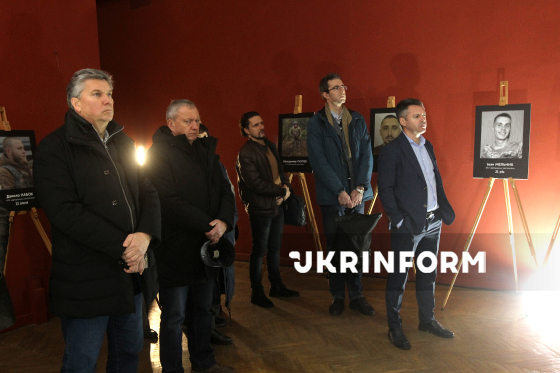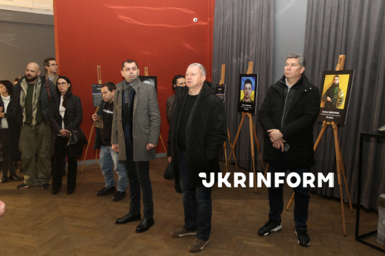 Ексміністр культури України, директор-художній керівник Дніпровського академічного театру опери та балету Ростислав Карандєєв (праворуч) бере участь у відкритті виставки світлин загиблих у російсько-українській війні студентів і випускників дніпровських вищих навчальних закладів з короткими історіями про них у межах презентації нового культурного проєкту "Історія в паралелях", присвяченого увічненню пам’яті героїв, у Дніпровському художньому музеї, Дніпро, 22 грудня 2025 року.