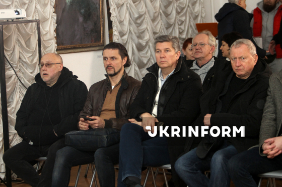 Ексміністр культури України, директор-художній керівник Дніпровського академічного театру опери та балету Ростислав Карандєєв (ліворуч), директор-художній керівник Дніпровського академічного театру драми та комедії (Драміком) Сергій Мазаний (у центрі) і заступник директора департаменту гуманітарної політики, начальник управління культури Дніпровської міської ради Євген Хорошилов (праворуч) беруть участь у презентації нового культурного проєкту "Історія в паралелях", присвяченого увічненню пам’яті студентів і випускників дніпровських вищих навчальних закладів, які загинули, захищаючи Україну, у Дніпровському художньому музеї, Дніпро, 22 грудня 2025 року.