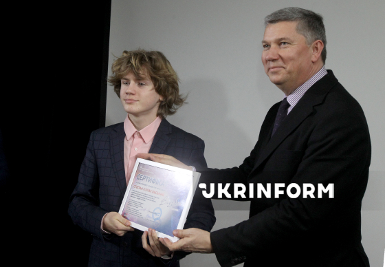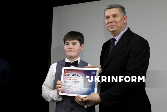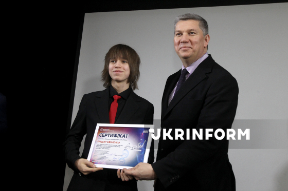 Учень міської дитячої музичної школи N15 Степан Кулаковський (ліворуч) та директор-художній керівник Дніпровського академічного театру опери та балету Ростислав Карандєєв позують для фото під час вручення пам’ятних сертифікатів учасникам проєкту в межах урочистого заходу за підсумками мистецького проєкту "Classic-тур "Вам, любі!- 2026", який об’єднує талановиту молодь міських мистецьких шкіл, відомих музикантів та спрямований на підтримку та розвиток мистецької освіти, Дніпро, 13 березня 2026 року.
