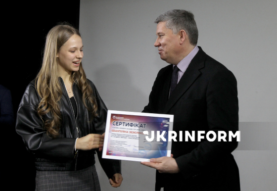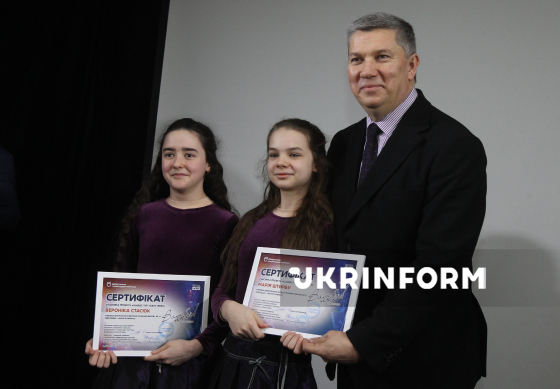Учениця міської дитячої музичної школи N3 "АРТДЕБЮТ" Євангеліна Зезюлінська та директор-художній керівник Дніпровського академічного театру опери та балету Ростислав Карандєєв позують для фото під час вручення пам’ятних сертифікатів учасникам проєкту в межах урочистого заходу за підсумками мистецького проєкту "Classic-тур "Вам, любі!- 2026", який об’єднує талановиту молодь міських мистецьких шкіл, відомих музикантів та спрямований на підтримку та розвиток мистецької освіти, Дніпро, 13 березня 2026 року.