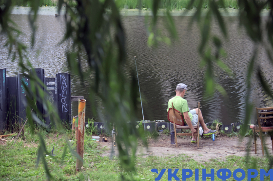 Чоловік рибалить на Русанівському каналі, Київ, 9 липня 2025 року.