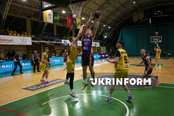 Гравець БК "Старий Луцьк" Святослав Товкач (ліворуч) закидає м’яч до кошика під час матчу регулярного чемпіонату Суперліги проти БК "Київ-Баскет", що завершився перемогою його команди з рахунком 90:72, Івано-Франківськ, 7 лютого 2026 року.
