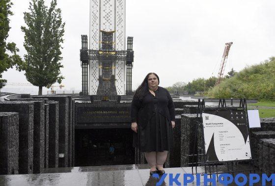 Виконувачка обов’язків генерального директора музею Голодомору-геноциду Леся Гасіджак позує для фото біля Національного музею Голодомору-геноциду у межах інтерв`ю кореспонденту Українського національного інформаційного агентства “Укрінформ”, Київ, 27 липня 2023 року.