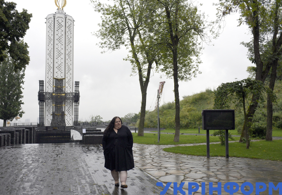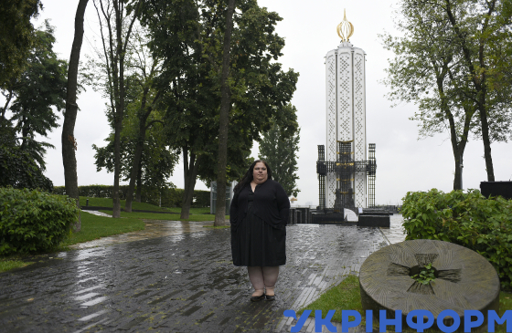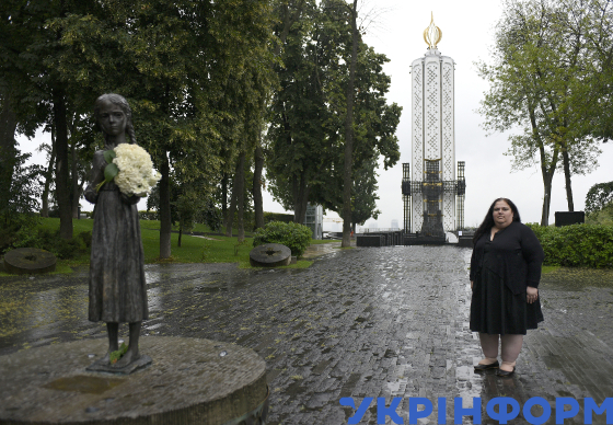 Виконувачка обов’язків генерального директора музею Голодомору-геноциду Леся Гасіджак позує для фото біля скульптури дівчинки з колосками в руках “Гірка пам`ять дитинства” на території Національного музею Голодомору-геноциду у межах інтерв`ю кореспонденту Українського національного інформаційного агентства “Укрінформ”, Київ, 27 липня 2023 року.