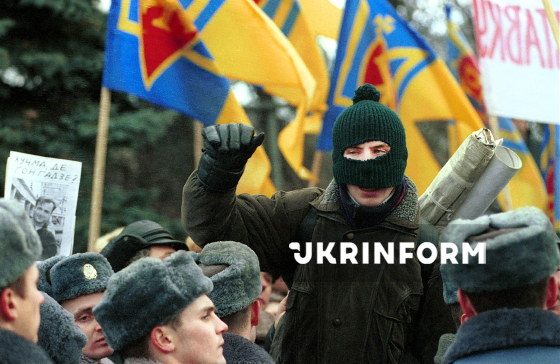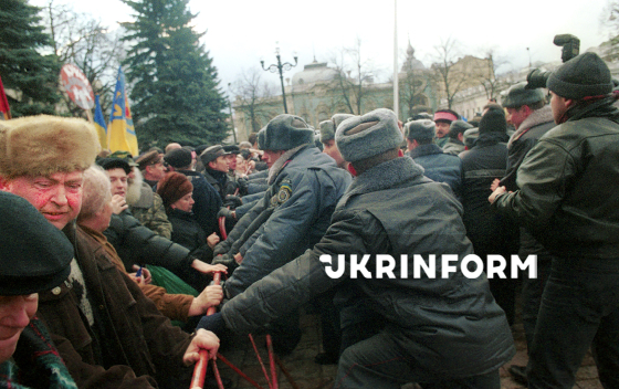 Учасники акції "Україна без Кучми" та правоохоронці біля будівлі Верховної Ради України під час мітингу з приводу повільного розслідування справи зникнення журналіста Георгія Гонгадзе, Київ, 19 грудня 2000 року. Фото Сергія Гутієва.