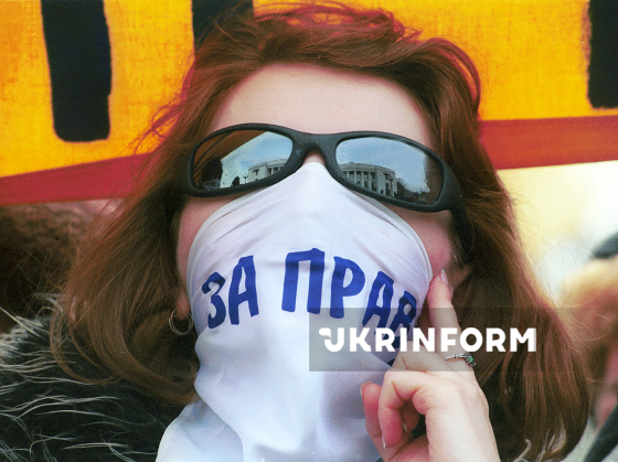 Учасниця протесту із закритим обличчям у день 1-ї річниці акції "Україна без Кучми" біля будинку Верховної Ради України, Київ, 14 березня 2001 року. Фото Сергія Гутієва.