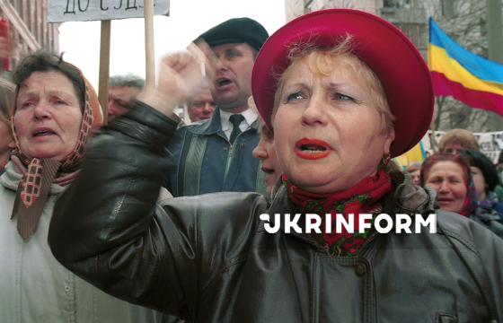 Учасники протесту з прапорами та банерами в день 1-ї річниці акції "Україна без Кучми" йдуть вулицею міста, Київ, 14 березня 2001 року. Фото Сергія Гутієва.