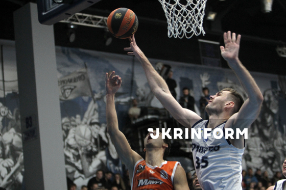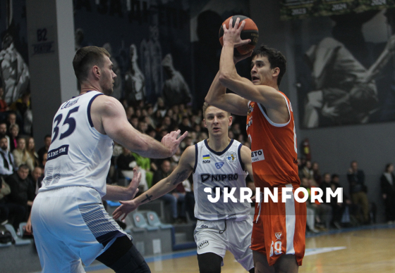Гравці БК "Дніпро" Сергій Загреба (праворуч) та БК "Харківські Соколи" Владислав Чевердін беруть участь у матчі чемпіонату України з баскетболу серед команд Суперліги, що завершився перемогою господарів з рахунком 98:58, у залі СК "Шинник", Дніпро, 28 лютого 2026 року. Гру розпочали ще 1 лютого, але через повітряну тривогу матч було зупинено за 7:47 до кінця другої чверті за рахунку 35:11 на користь дніпрян.