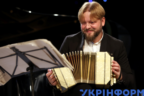 Бандонеоніст Сергій Курдицький під час концерту колективу FueGo Orchestra з програмою "Територія танго" на сцені Івано-Франківської обласної філармонії імені Іри Маланюк, Івано-Франківськ, 1 листопада 2024 року.