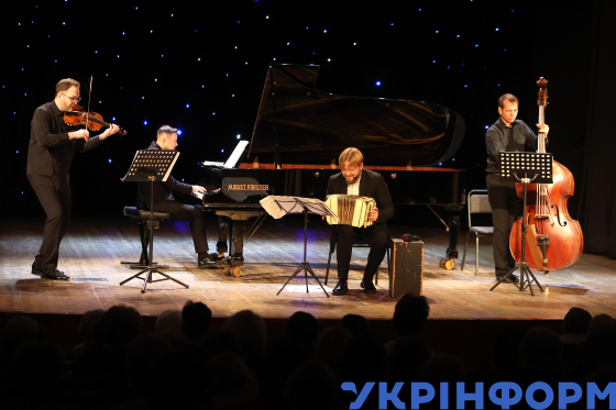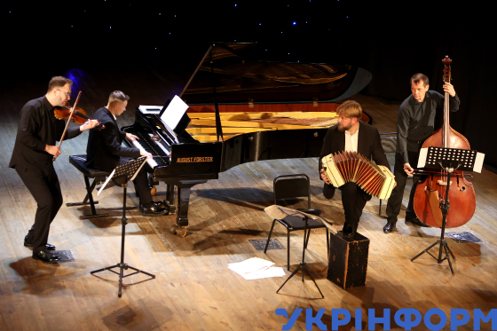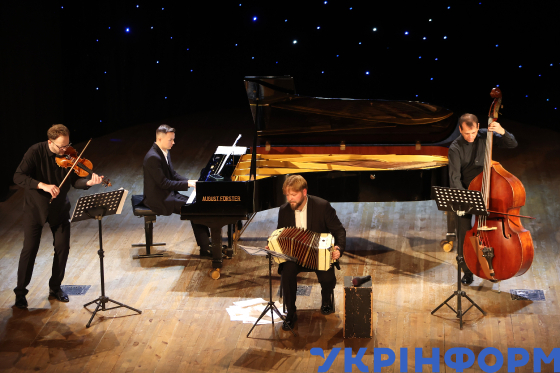Скрипаль Назарій Пилатюк, піаніст Юрій Салуха, бандонеоніст Сергій Курдицький та контрабасист Дмитро Третяк (зліва направо) під час концерту колективу FueGo Orchestra з програмою "Територія танго" на сцені Івано-Франківської обласної філармонії імені Іри Маланюк, Івано-Франківськ, 1 листопада 2024 року.