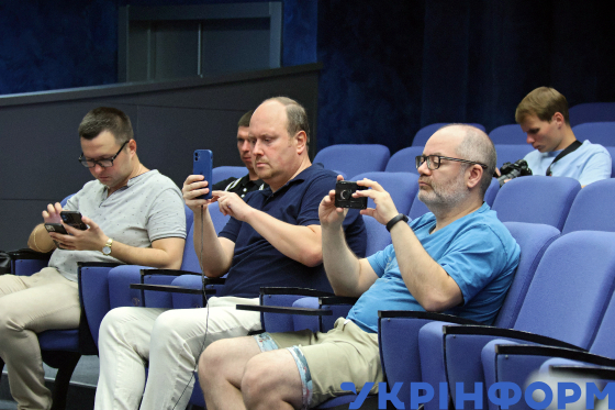 Жіурналісти під час спільної пресконференції головного тренера національної збірної України з футболу Сергія Реброва та головного тренера молодіжної збірної України з футболу Унаї Мельгоси, присвяченої виступу юнацьких та національної збірних України на чемпіонатах Європи та планам і завданням національних збірних на наступний сезон, у Будинку футболу, Київ, 5 серпня 2024 року.