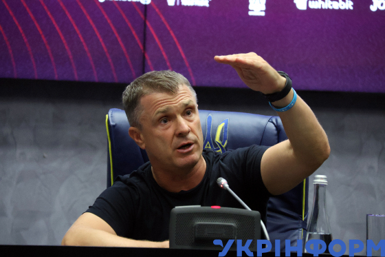 Головний тренер національної збірної України з футболу Сергій Ребров під час спільної з головним тренером молодіжної збірної України з футболу Унаї Мельгосою пресконференції, присвяченої виступу юнацьких та національної збірних України на чемпіонатах Європи та планам і завданням національних збірних на наступний сезон, у Будинку футболу, Київ, 5 серпня 2024 року.
