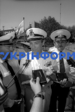 Головнокомандувач об’єднаними ВМС НАТО у Південній Європі Маріо Анжелі в рамках програми "Партнерство заради миру" побував на фрегаті "Гетьман Сагайдачний", АР Крим, травень 1996 року. Фото Сергія Світлицького.