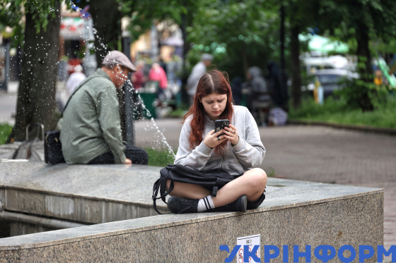 Дівчина з телефоном у руках сидить на фонтані на Соборній площі, Одеса, 27 травня 2025 року.
