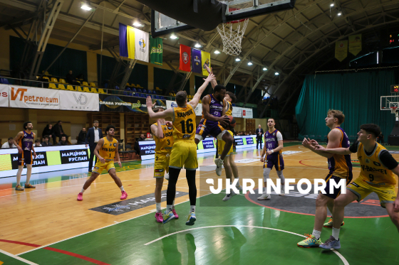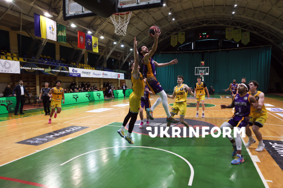 Ігровий момент матчу регулярного чемпіонату Суперліги між БК "Старий Луцьк" (жовто-фіолетова форма) та БК "Київ-Баскет", що завершився перемогою луцької команди з рахунком 90:72, Івано-Франківськ, 7 лютого 2026 року.
