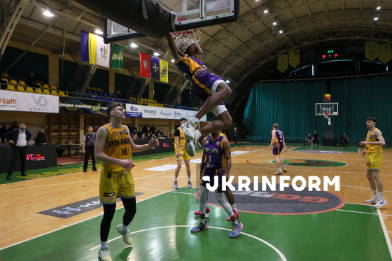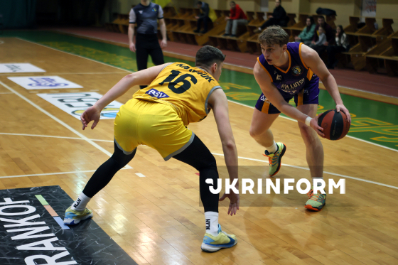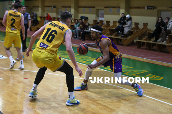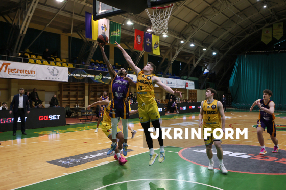 Гравець БК "Київ-Баскет" Ярослав Карпюк (ліворуч) бере участь у матчі регулярного чемпіонату Суперліги проти БК "Старий Луцьк", що завершився поразкою його команди з рахунком 72:90, Івано-Франківськ, 7 лютого 2026 року.