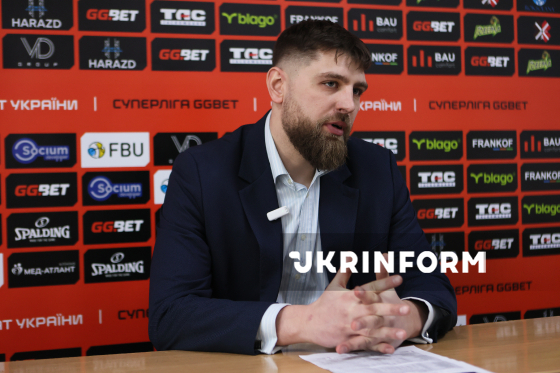 Головний тренер БК "Старий Луцьк" Нікіта Воєвода бере участь у пресконференції після матчу регулярного чемпіонату Суперліги проти БК "Київ-Баскет", що завершився перемогою його команди з рахунком 90:72, Івано-Франківськ, 7 лютого 2026 року.
