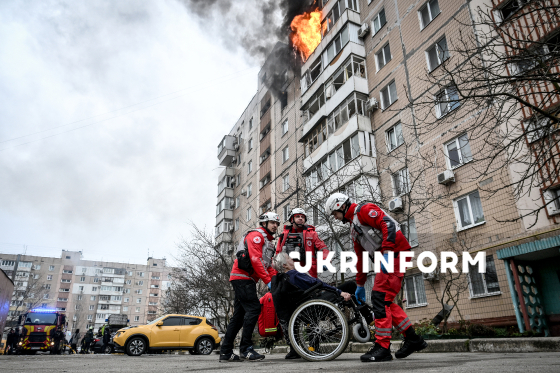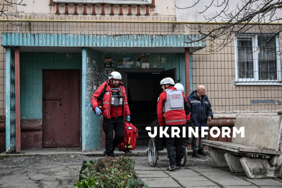 Волонтер загону швидкого реагування ТЧХУ веде під руку літню жінку поміж уламків двором п’ятиповерхового житлового будинку у Святошинському районі столиці, який було пошкоджено внаслідок російської дронової атаки, Київ, 23 грудня 2025 року.