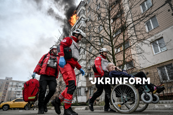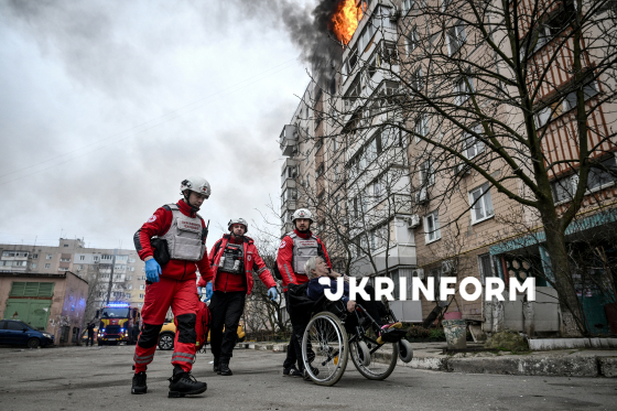 Волонтери загону швидкого реагування ТЧХУ евакуюють маломобільну жінку похилого віку з багатоповерхового житлового будинку, в який влучив російський КАБ, спричинивши масштабну пожежу, Запоріжжя, 17 грудня 2025 року.