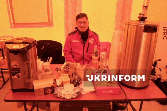 Волонтер ТЧХУ чергує за столиком з гарячими напоями та снеками у наметі обігріву, встановленому у Деснянському районі Києва, 12 січня 2026 року. На час відновлення після чергового російського обстрілу стабільної роботи енергосистеми рятувальники забезпечують мешканцям лівобережної частини столиці можливість зігрітися, підзарядити гаджети та за потреби отримати психологічну допомогу у мобільних пунктах незламності, що функціонують на базі наметів ДСНС. Кожен з них оснащений тепловими гарматами, генераторами та місцем відпочинку для відвідувачів. Разом із надзвичайниками у наметах чергують представники Товариства Червоного Хреста України, які допомагають, а також можуть пригостити гарячим чаєм.