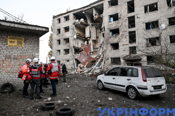 Волонтери загону швидкого реагування ТЧХУ стоять неподалік від частково зруйнованої внаслідок нічної комбінованої атаки військ РФ будівлі гуртожитку, де стався обвал поверхів, Запоріжжя, 30 жовтня 2025 року. Вночі ворог скерував на місто 8 ракет та 20 БПЛА. Внаслідок обстрілу пошкоджено багатоповерхівки, приватні будинки, є руйнування на підприємствах. Поранень дістали 17 людей, ще двоє загинули.
