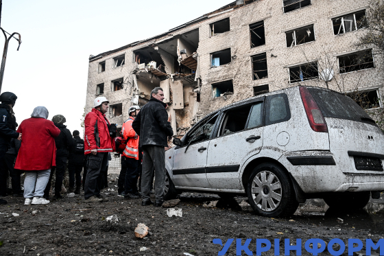 Місцеві жителі, волонтери загону швидкого реагування ТЧХУ та правоохоронці стоять біля частково зруйнованої внаслідок нічної комбінованої атаки військ РФ будівлі гуртожитку, де стався обвал поверхів, Запоріжжя, 30 жовтня 2025 року. Вночі ворог скерував на місто 8 ракет та 20 БПЛА. Внаслідок обстрілу пошкоджено багатоповерхівки, приватні будинки, є руйнування на підприємствах. Поранень дістали 17 людей, ще двоє загинули.