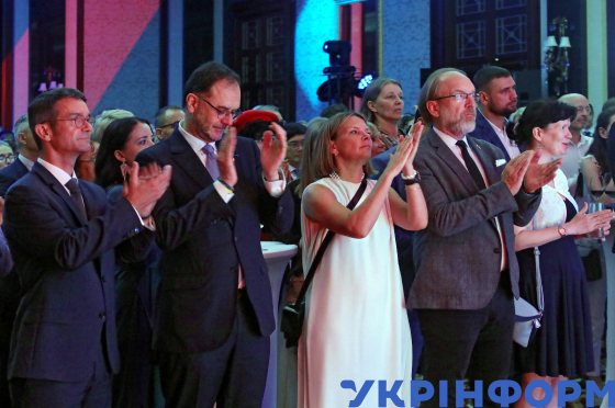 Надзвичайний і Повноважний Посол Ірландії в Україні Тереса Мартіна Хілі, Надзвичайний і Повноважний Посол Японії в Україні Мацуда Кунінорі (зліва направо), Президент Національного паралімпійського комітету України, голова Комітету Верховної Ради України у справах пенсіонерів, ветеранів та інвалідів Валерій Сушкевич (у центрі) з сином Михайлом, директор і художній керівник Київського національного академічного театру оперети Богдан Струтинський (у центрі на другому плані), радник Посольства Суверенного Мальтійського Ордену в Україні Андрій Ханас, Надзвичайний і Повноважний Посол Канади в Україні Наталка Цмоць (справа наліво) під час урочистого прийому з нагоди Національного свята Французької Республіки - 235-ї річниці взяття Бастилії, Київ, 17 липня 2024 року.