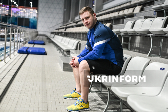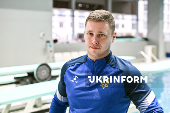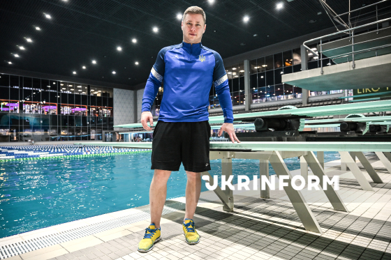 Головний тренер збірної України зі стрибків у воду Ілля Цейлютін позує для фото під час запису інтерв’ю для Українського національного інформаційного агентства "Укрінформ" у Центрі водних видів спорту "ЛІКО", Київ, 18 березня 2026 року.