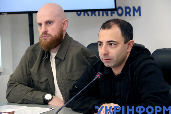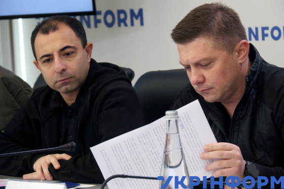 Радник міністра внутрішніх справ з ветеранської політики Дмитро Фінашин, заступник міністра ветеранів України Фархад Фархадов (зліва направо) беруть участь у “круглому столі” на тему: ”Запровадження програм ресоціалізації ветеранів російсько-української війни, які засуджені до покарань, не пов’язаних із позбавленням волі”, Київ, 22 жовтня 2025 року.