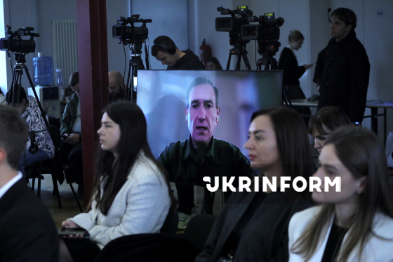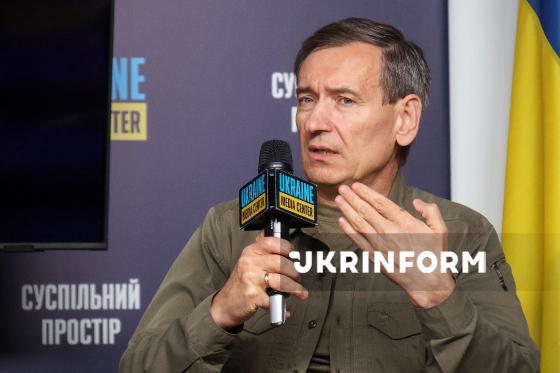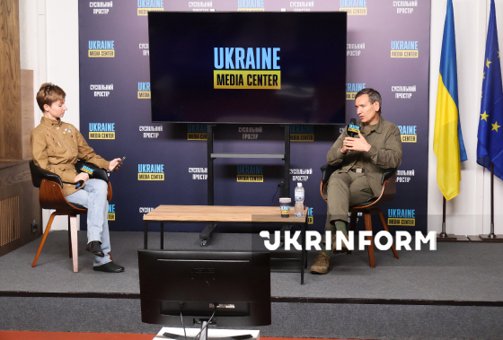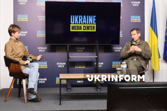 Модераторка Світлана Чепуренко і народний депутат України, член комітету Верховної Ради України з питань національної безпеки, оборони та розвідки Федір Веніславський беруть участь у брифінгу на тему: "Зміни в ЗСУ: нові контракти у війську, передача повноважень ТЦК до ЦНАП та чого варто очікувати від мобілізації" у Медіацентрі Україна, Київ, 12 листопада 2025 року.