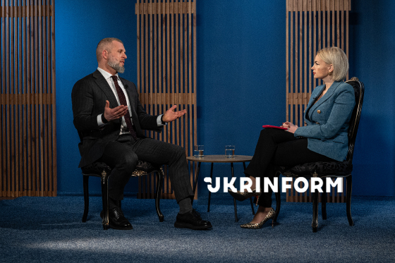 Голова Антимонопольного комітету України Павло Кириленко та журналістка Христя Равлюк позують для фото в межах запису програми Укрінформу "Є Розмова", Київ, 27 березня 2026 року.
