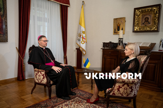 Апостольський нунцій в Україні архієпископ Вісвальдас Кульбокас і журналістка Христя Равлюк спілкуються під час запису програми Укрінформу “Є Розмова”, Київ, 11 березня 2026 року.