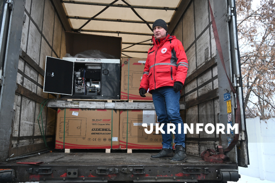 Заступник генерального директора Українського Червоного Хреста Ілля Клецьковський (у центрі) бере участь у передачі першої партії з 76 аварійних генераторів зі стратегічних резервів ЄС, що прибули до столиці, Київ, 27 січня 2026 року. Загалом Україна отримає 447 генераторів для підтримки послуг з тепло- та водопостачання, зокрема у навчальних, соціальних та медичних закладах, укриттях і пунктах обігріву у столиці та прифронтових громадах, постраждалих після російських ударів по енергетичній інфраструктурі країни.