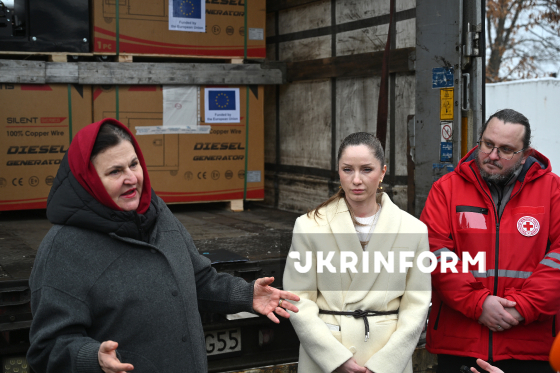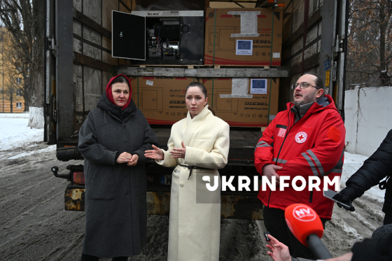 Посол Європейського Союзу в Україні Катаріна Матернова (ліворуч), заступниця міністра розвитку громад та територій України Марина Денисюк і заступник генерального директора Українського Червоного Хреста Ілля Клецьковський відповідають на запитання журналістів під час передачі першої партії з 76 аварійних генераторів зі стратегічних резервів ЄС, що надійшла до столиці, Київ, 27 січня 2026 року. Загалом Україна отримає 447 генераторів для підтримки послуг з тепло- та водопостачання, зокрема у навчальних, соціальних та медичних закладах, укриттях і пунктах обігріву у столиці та прифронтових громадах, постраждалих після російських ударів по енергетичній інфраструктурі країни.