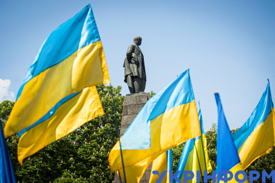 Розгорнуті державні прапори біля пам’ятника поету Тарасові Шевченку на Чернечій горі з нагоди 150-річчя перепоховання його праху, Канів, Черкаська область, 22 травня 2011 року. Фото Анастасії Сироткіної.