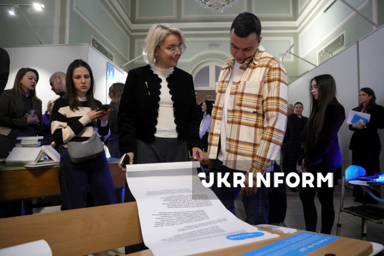 Учасники презентації виставкового проєкту "Клас" - мультимедійної інсталяції, присвяченої українським підліткам, чиє дорослішання та освіта припали на роки повномасштабної війни, - у Національній академії мистецтв України, Київ, 13 лютого 2026 року.