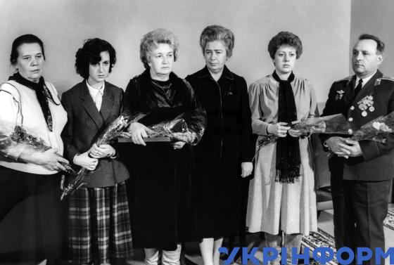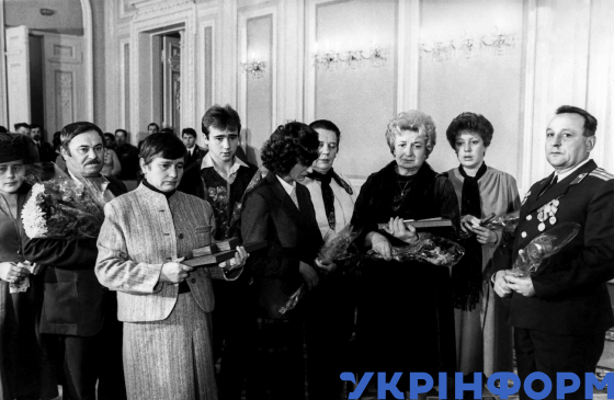 Родини героїв-ліквідаторів наслідків аварії на ЧАЕС Віктора Кібенка і Володимира Правика після вручення нагород, Київ, 6 листопада 1986 року. Фото Юзефа Мосенжника і Володимира Самохоцького.