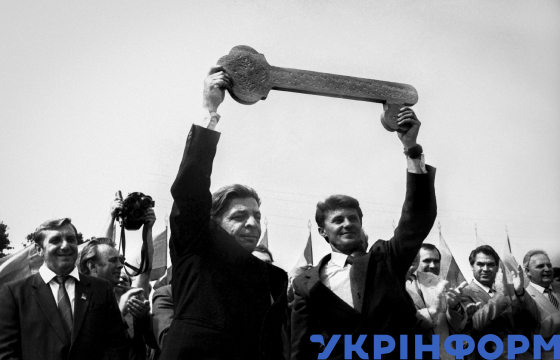 Павло Козленко та Володимир Дружко (зліва направо) тримають символічний ключ від квартир, збудованих для переселенців із Чорнобильского району в новому селищі Тернопільське Макарівського району, Київська область, серпень 1986 року. Фото Юзефа Мосенжника.