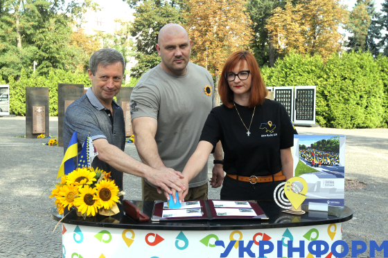 Заступник голови Дніпропетровської обласної спілки філателістів Дмитро Семиренко, начальник Дніпропетровської обласної військової адміністрації Сергій Лисак і директорка із взаємодії з державними органами влади АТ "Укрпошта" Юлія Боровик (зліва направо) під час церемонії спецпогашення благодійної марки "Хвилина мовчання" художника Сергія Майдукова, введеної Укрпоштою в обіг у День пам’яті загиблих захисників України, на Алеї Героїв біля ДніпроОВА, Дніпро, 29 серпня 2024 року.