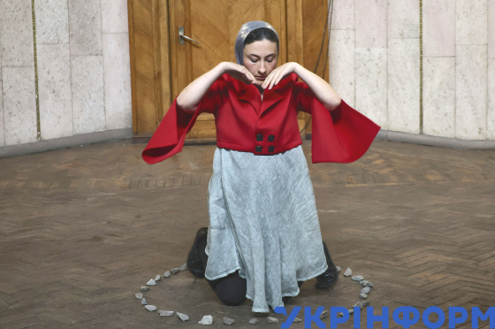 Хореографка Юлія Гришина (у центрі) під час танцювального site-specific перформансу "Тепло холодних стін" у будівлі Держпрому, Харків, 7 травня 2025 року.
