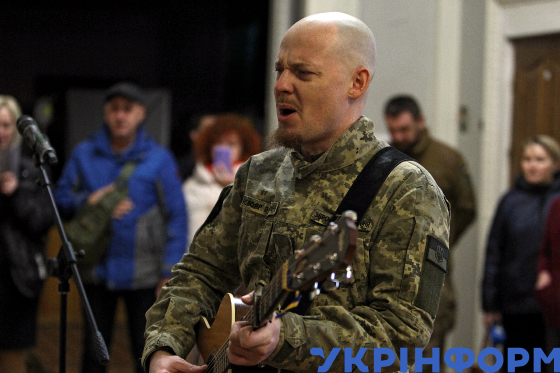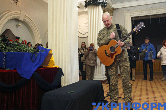 Лідер гурту "Тінь Сонця” Сергій Василюк грає на гітарі і співає під час церемонії прощання з актором театру та кіно, бійцем Третьої штурмової бригади Яковом Ткаченком у Дніпровському театрі драми та комедії, Дніпро, 19 грудня 2024 року.