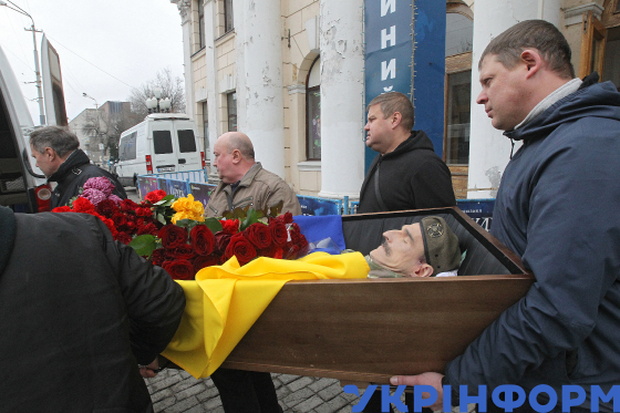 Люди прощаються з актором театру та кіно, бійцем Третьої штурмової бригади Яковом Ткаченком у залі Дніпровського театру драми та комедії, Дніпро, 19 грудня 2024 року.